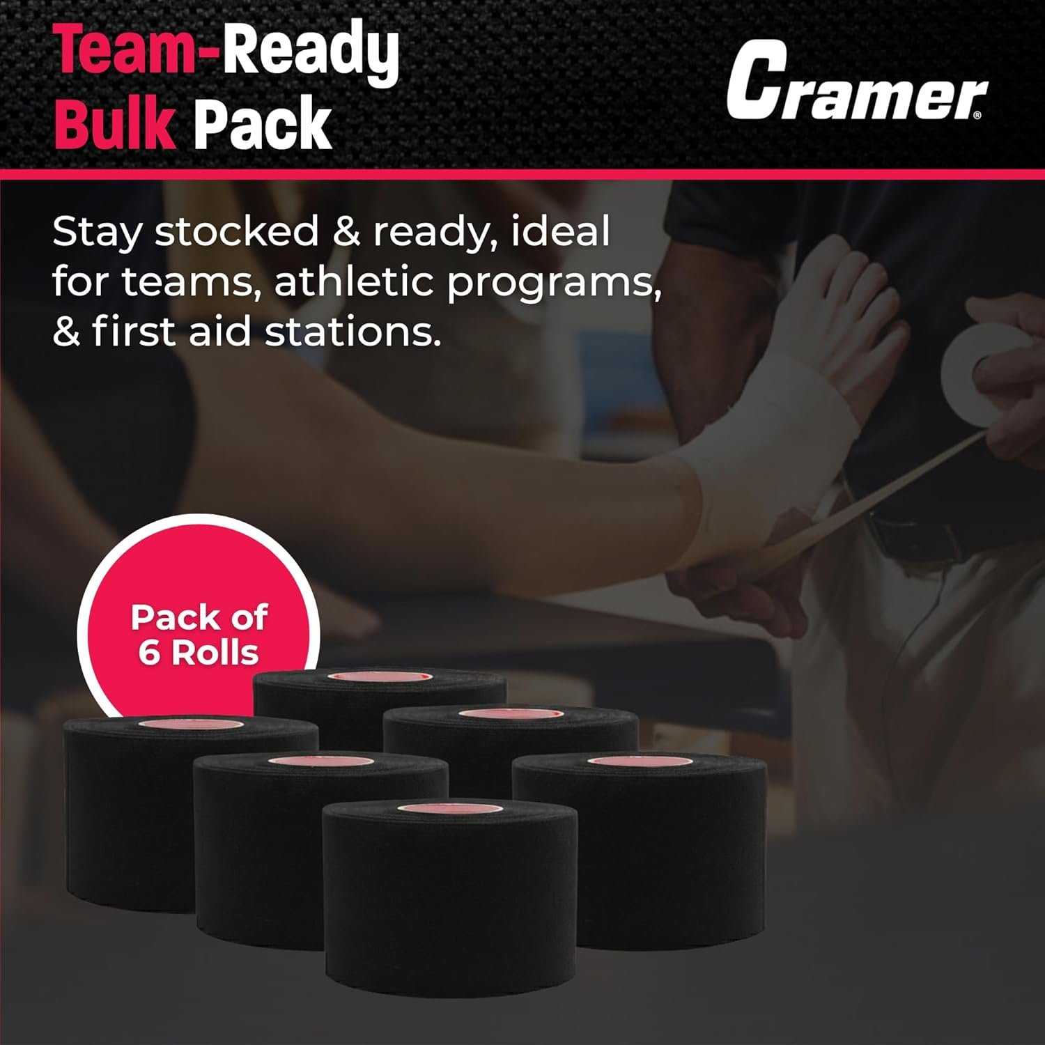 The Cramer Athletic Tape 6 Pack offers strong, professional-grade support ideal for athletes, coaches, and trainers. Each easy-tear roll is 1.5" x 10 yards, perfect for quick application on ankles, wrists, knees, or elbows without the need for scissors. With latex-free adhesive that minimizes irritation and bold color options to match any team, this sports tape from the Cramer Store is a top choice for reliable, lasting performance in any training or game situation.
